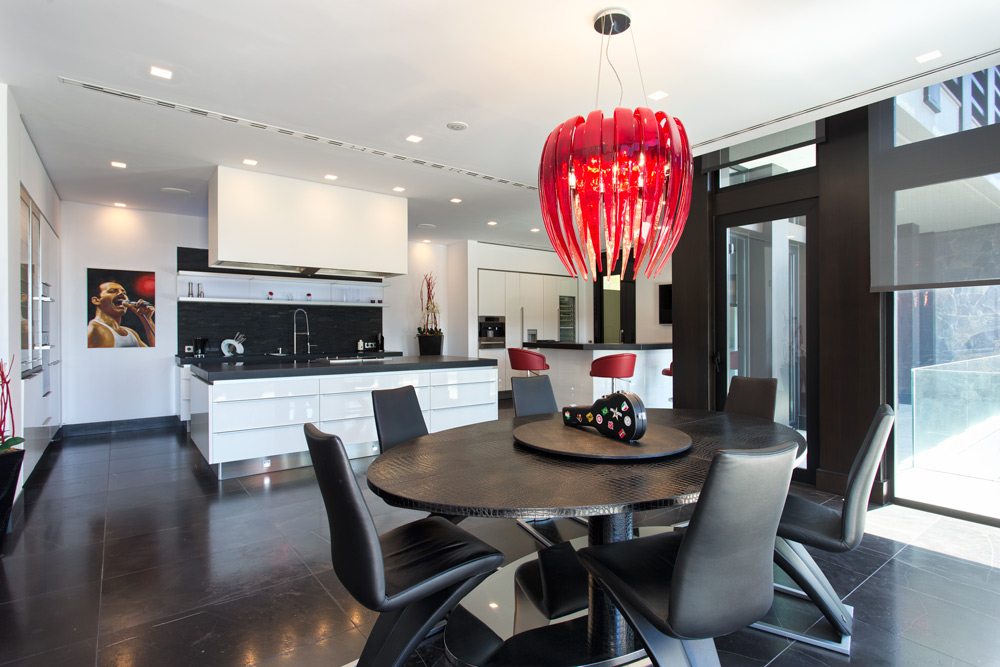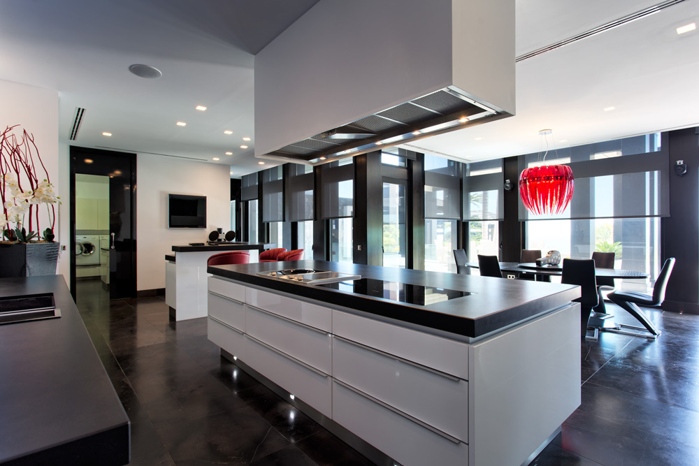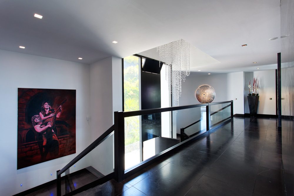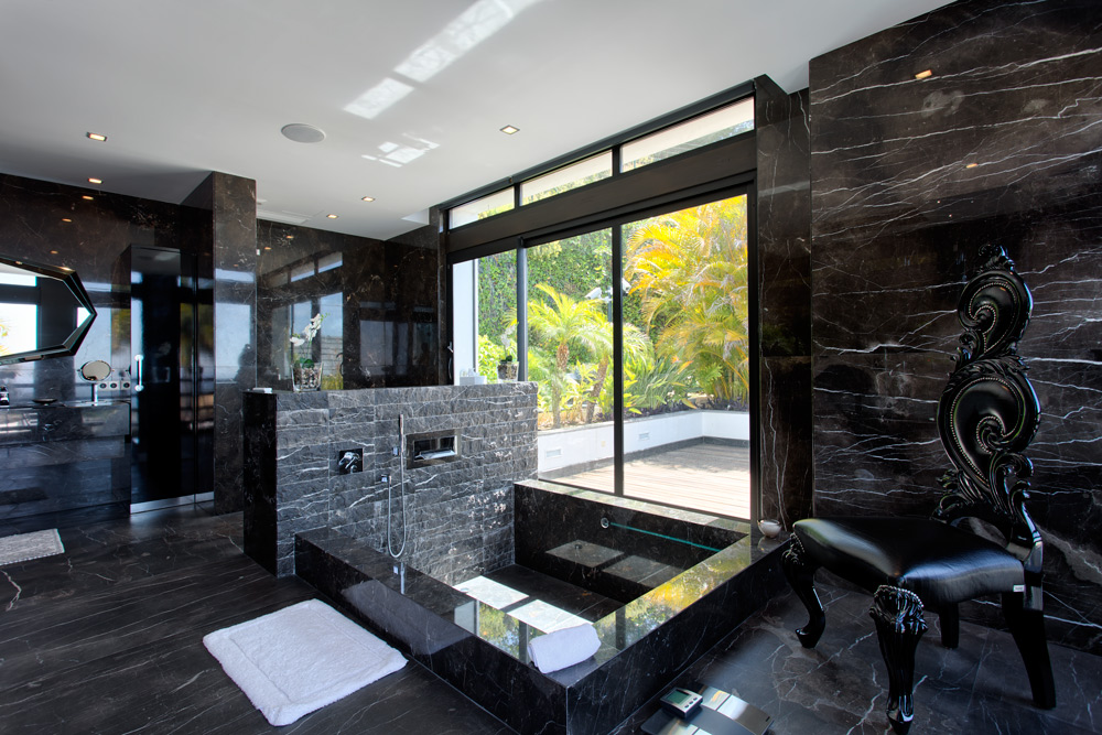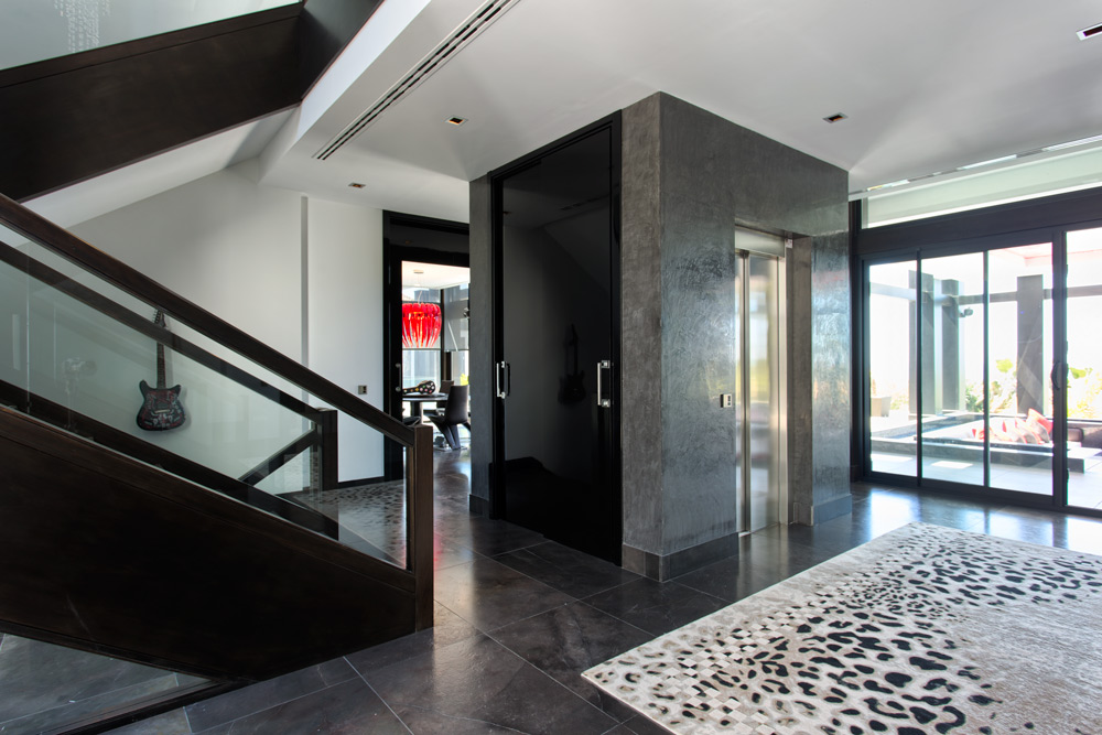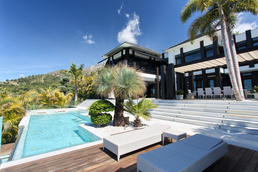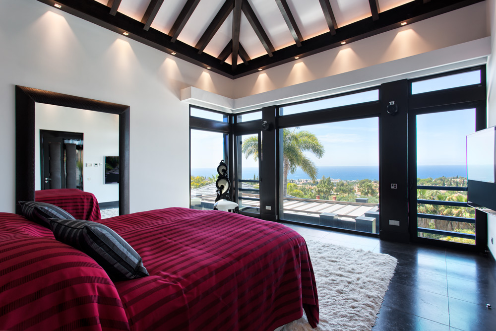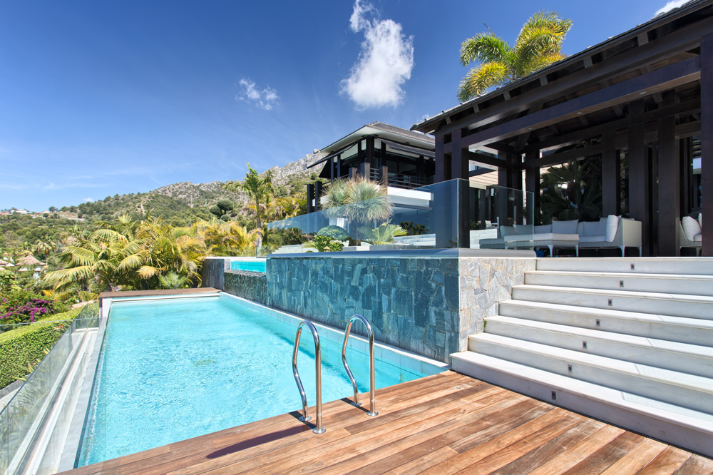 Overview: Top quality modern design, nicely situated on an elevated plot with spectacular sea views. Very quiet and private, still close to Marbella town and the beach. A driveway leads to the main entrance of the house. A grand hallway brings to the living and dining area and the fully fitted open plan kitchen. Direct access to the covered and open terraces, bbq and pool area with 3 different style pools (heated) all fit for outside living and relaxing. Upstairs a huge master bedroom en suite with dressing area, fitness and salon/bar and one guest bedroom en suite. Lower floors. Four bedrooms en suite, one fully fitted guest or staff apartment with two bedrooms and one bathroom, spa area with steam room, office, possible cinema room and garage for 4 to 5 cars. Fully fitted domotica system, B&O surround, under floor heating, A/C, elevator to all floors, outside parking. Gated community with 24hrs. security..