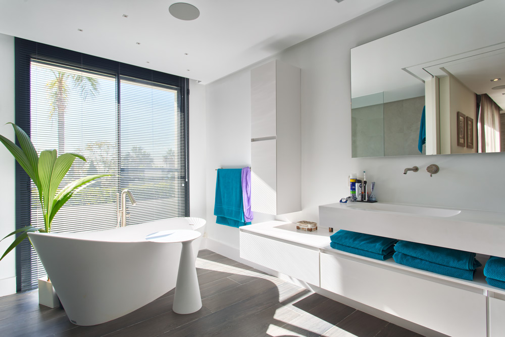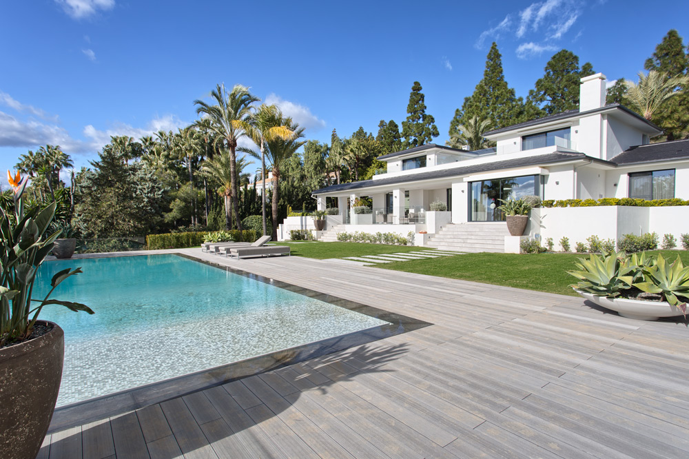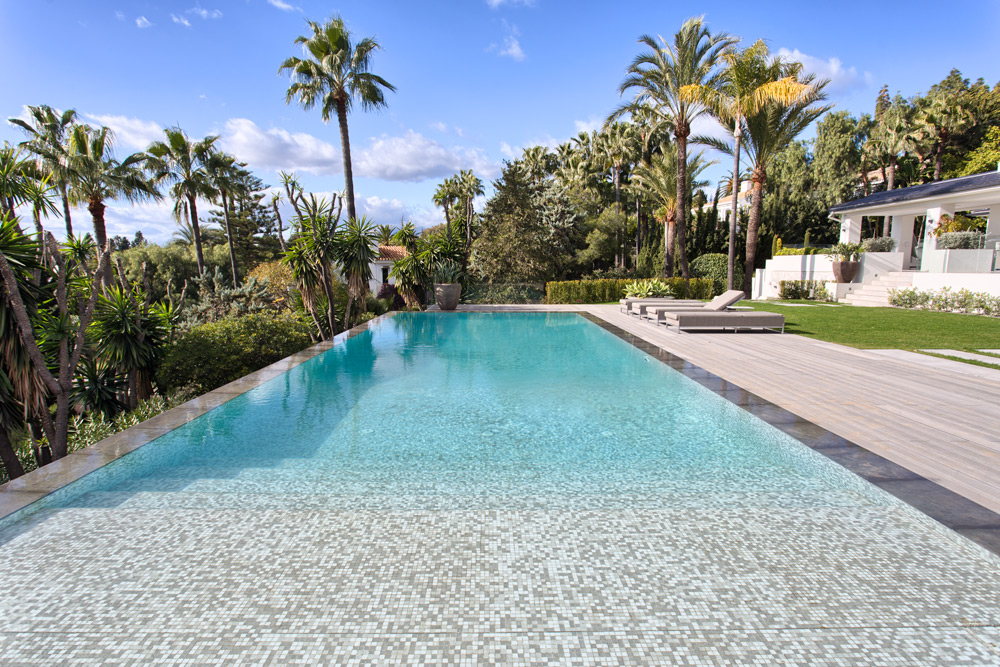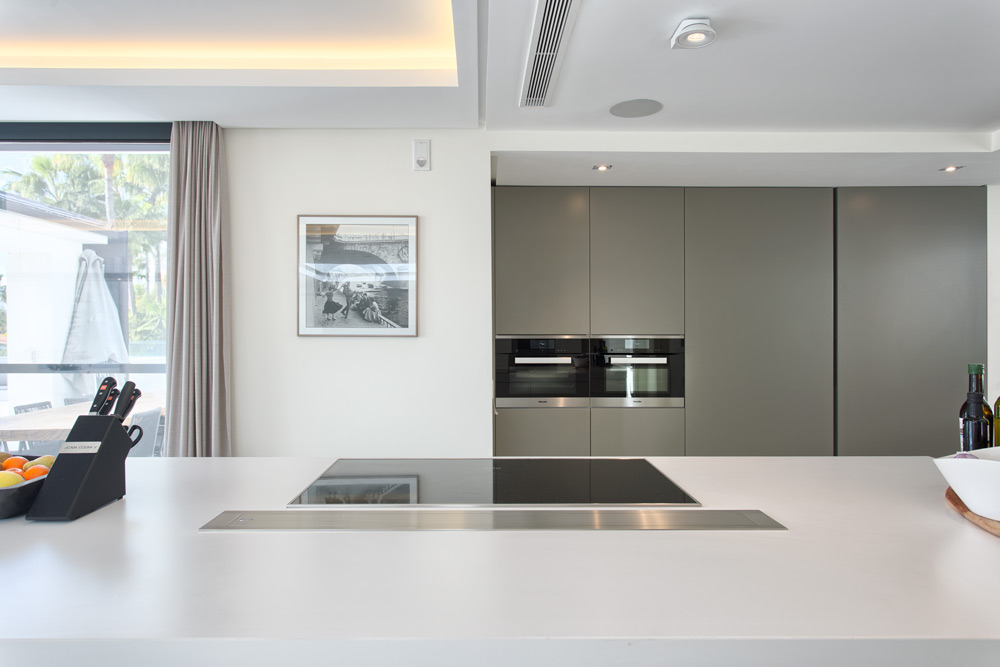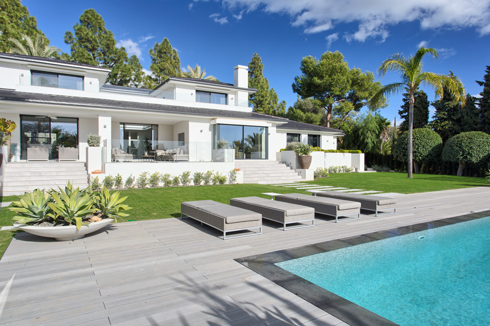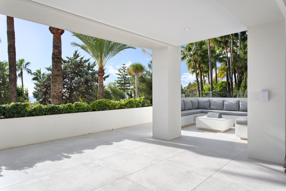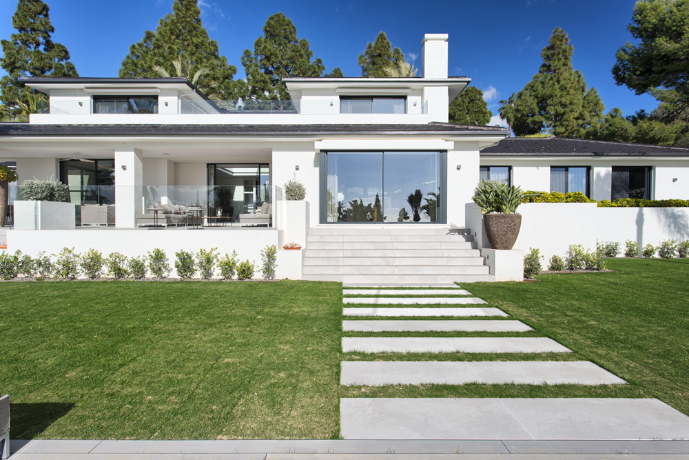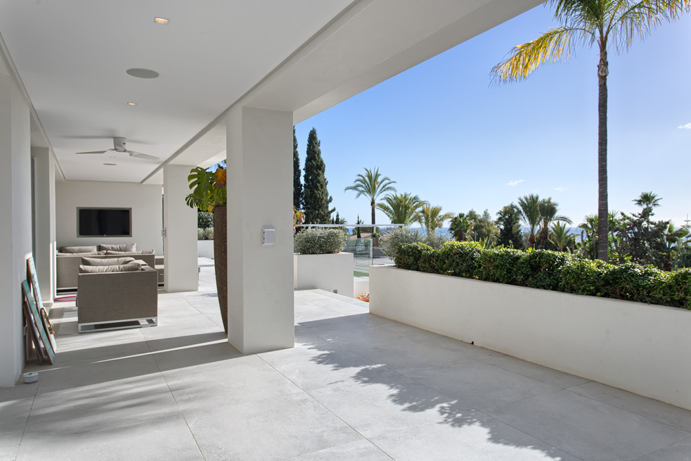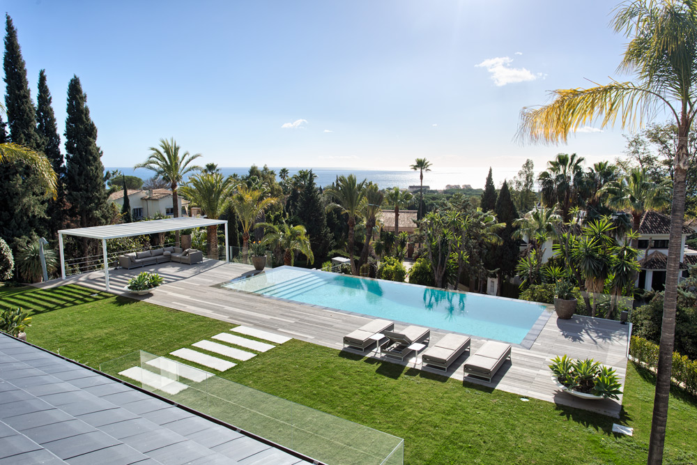 • Overview: Recently renovated top quality villa in the residential area of Hacienda Las Chapas. South to southwest facing, quiet and private. Stunning sea views. Main floor: Entrance hallway, spacious living and dining area with high ceilings and fully fitted open plan kitchen (Danespan with Miele appliances). Direct access to the terraces, garden and pool. Master bedroom suite, one guest bedroom and bathroom. First floor: Two guest bedrooms en-suite with own terraces. Lower floor: One bedroom with bathroom and a small kitchen, one car garage and storage. Extra area for a gym or games room. A big plot, mature gardens, infinity pool heated, A/C with heating and individual controlled, underfloor heating, integrated domotic system, sound system Sonos, outdoor kitchen and lounge area..